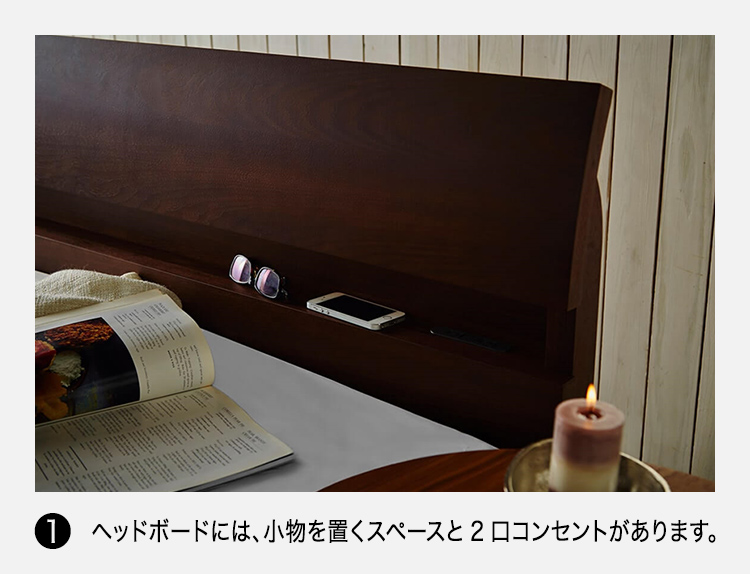 ヘッドボードの中棚には小物などを置けるスペース(奥行7cm)と2口コンセントが付いているので携帯電話の充電もできます。